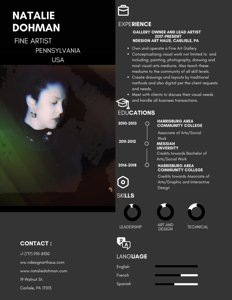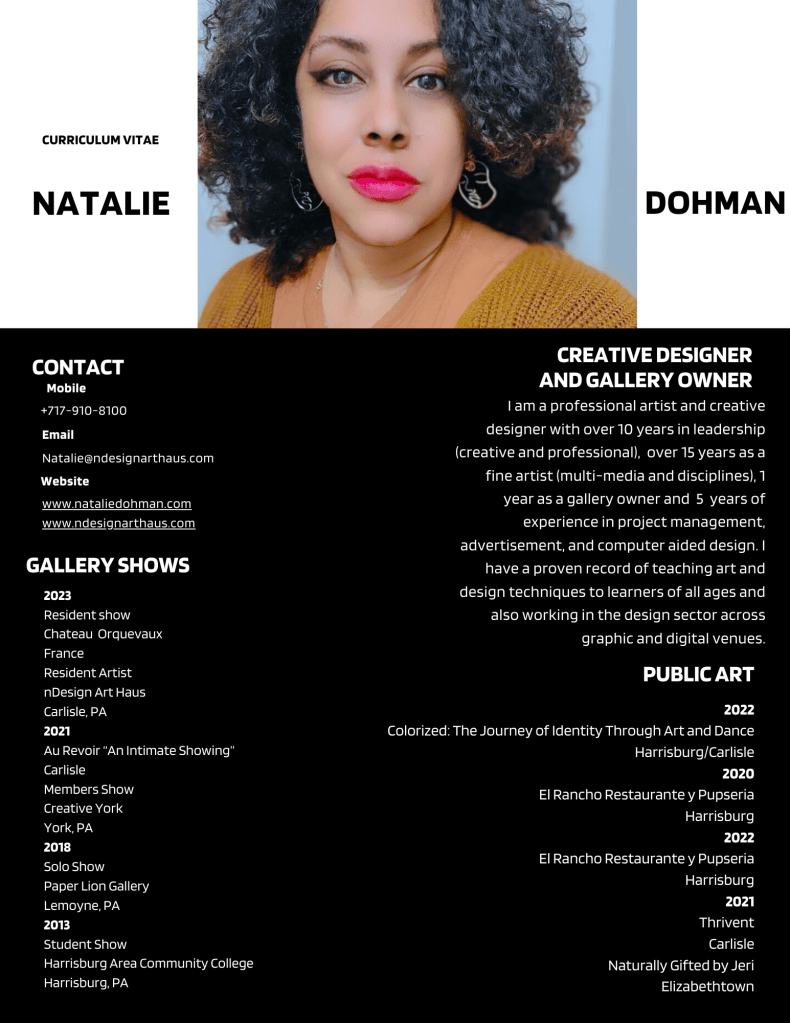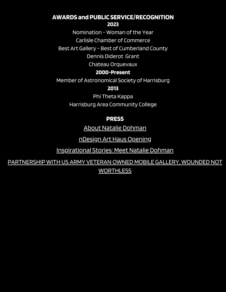 Natalie incorporated a multi-residential art gallery, nDesign Art Haus, in 2020 that was first located in Carlisle, Pennsylvania and opened its doors in 2022.
